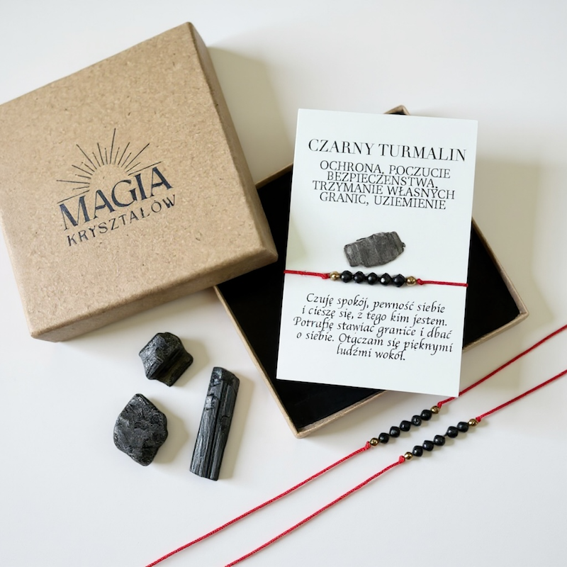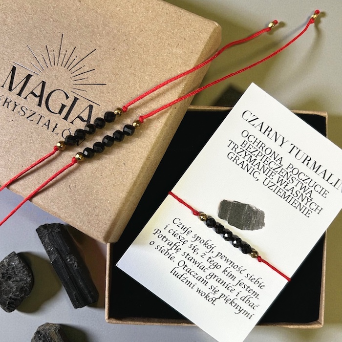 Łączy czarny turmalin – kamień ochrony i spokoju – z czerwonym sznurkiem, który symbolizuje siłę, odwagę i dobrą energię.