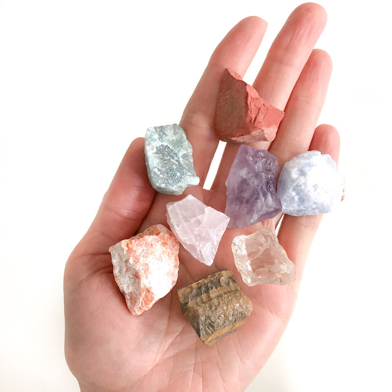 W zestawie znajdziesz 8 minerałów, 2 dla czakry serca i są to: jaspis czerwony, kalcyt ognisty, tygrysie oko, kwarc różowy i awenturyn, kalcyt błękitny, ametyst i kryształ górski.